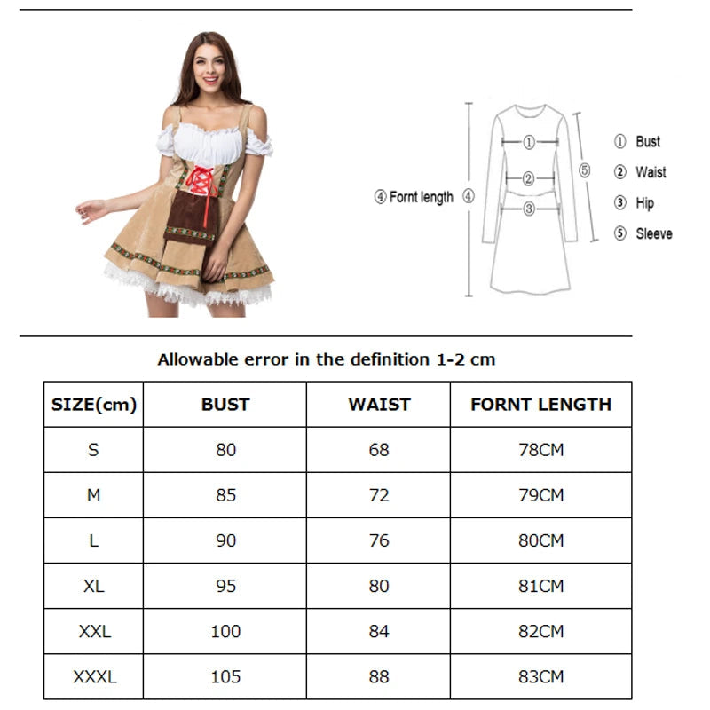 Para Ela (Dirndl): Um vestido clássico com corpete ajustável que valoriza a silhueta, avental detalhado e blusa com mangas bufantes, trazendo toda a delicadeza das garçonetes das vilas bávaras.