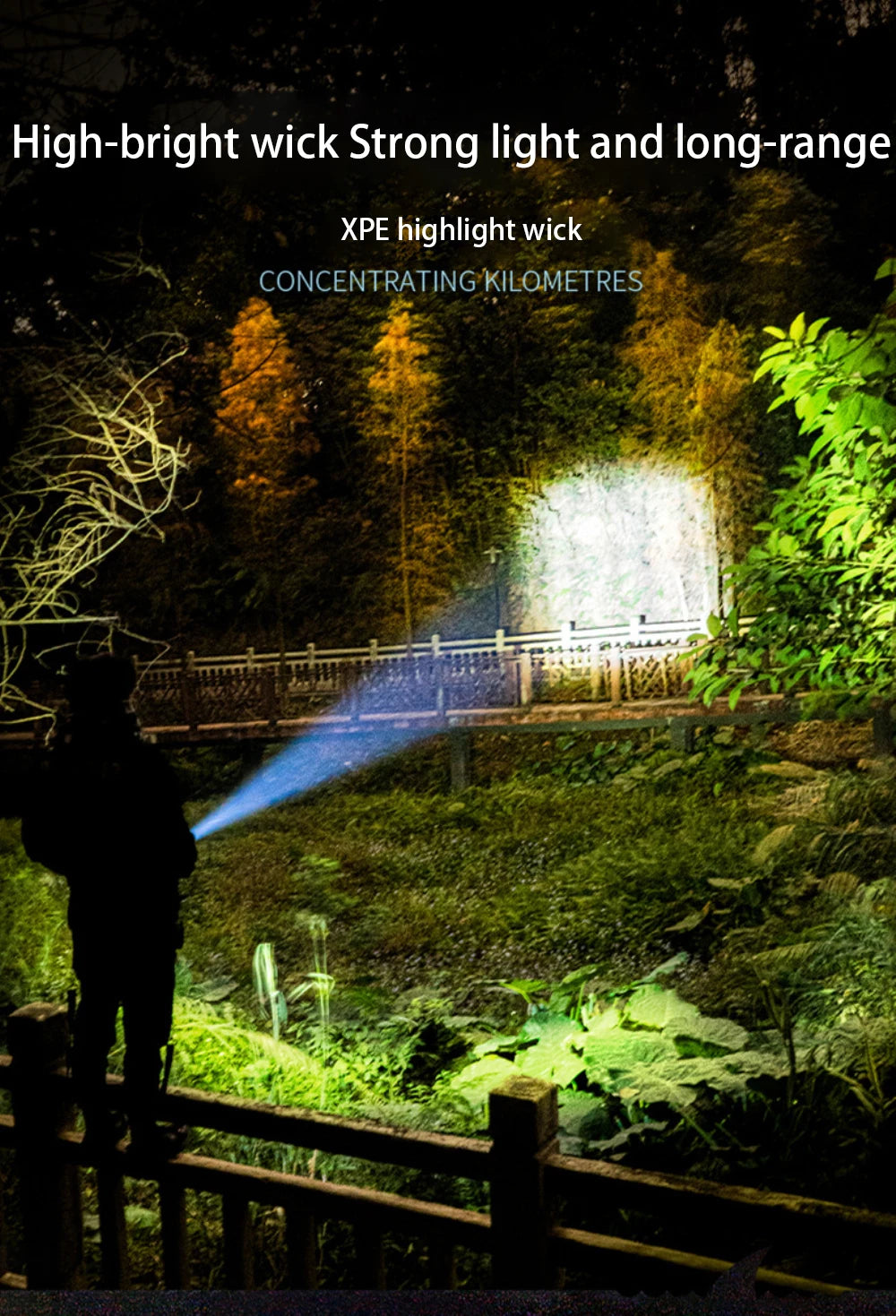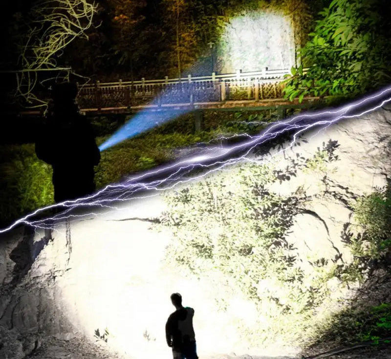 • Potência Incrível: Com uma capacidade declarada de 100000 Lúmens, esta lanterna projeta um feixe de luz extremamente intenso, transformando a noite em dia e garantindo visibilidade máxima a longas distâncias.