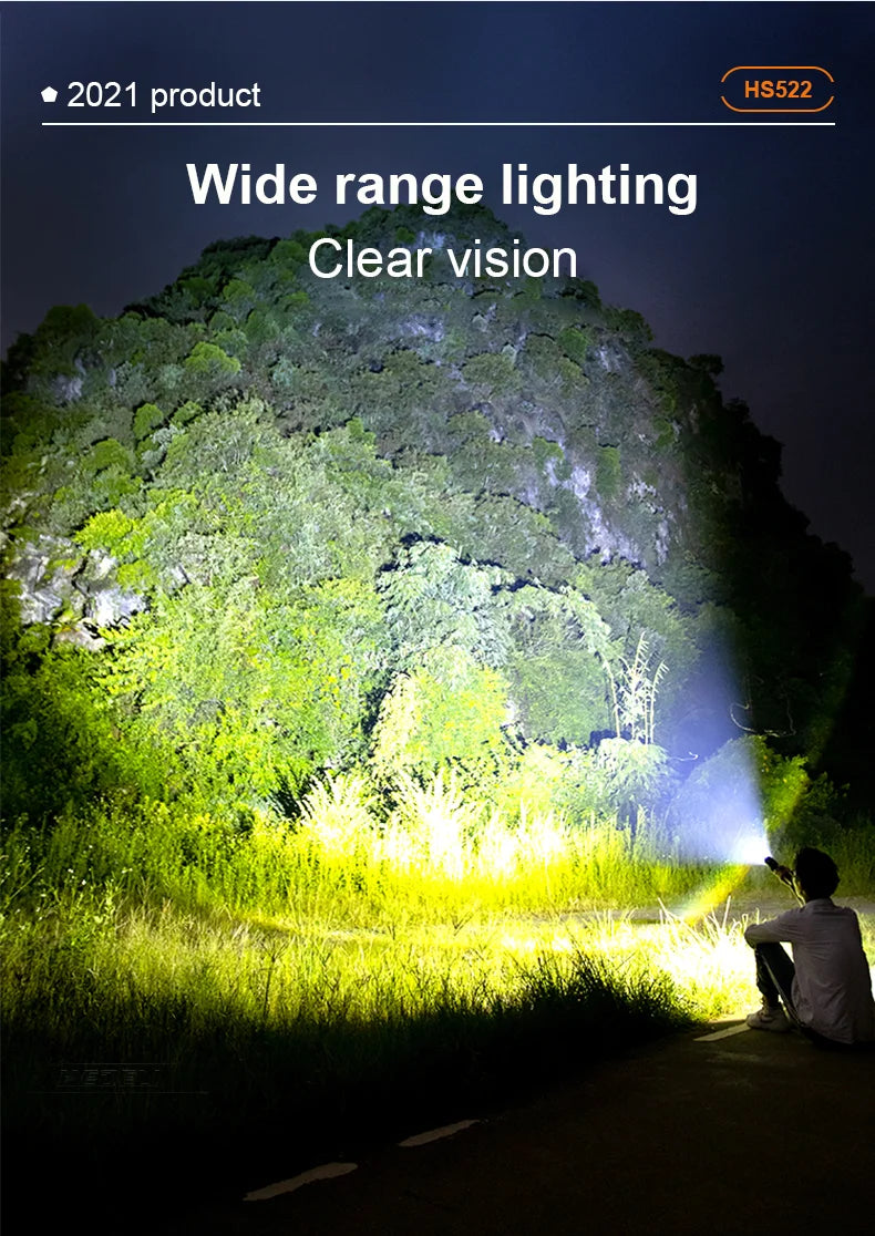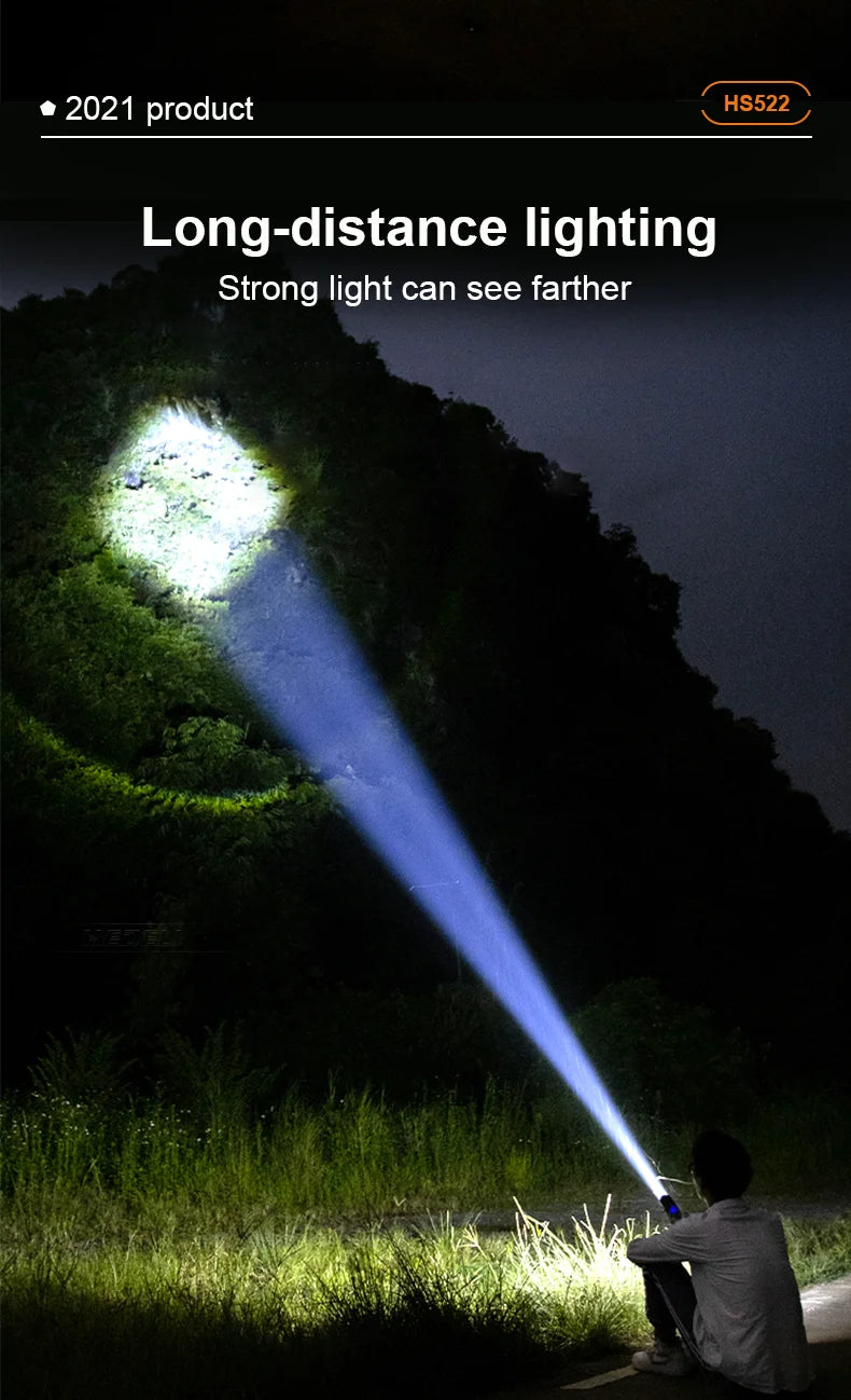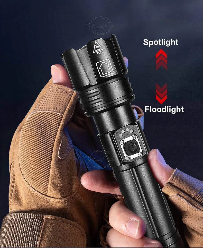 Projetada com um robusto corpo em liga de alumínio e equipada com o revolucionário chip LED de 300W, esta lanterna redefine o conceito de potência, transformando a noite em dia com um alcance que ultrapassa os 500 metros.