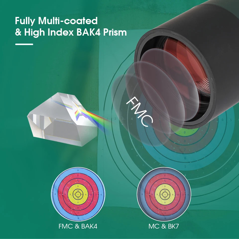 Lentes FMC (Fully Multi-Coated): Cada camada de vidro recebe múltiplos revestimentos táticos para maximizar a entrada de luz. Isso garante imagens brilhantes, com alto contraste e fidelidade de cores, mesmo em dias nublados ou durante o crepúsculo.