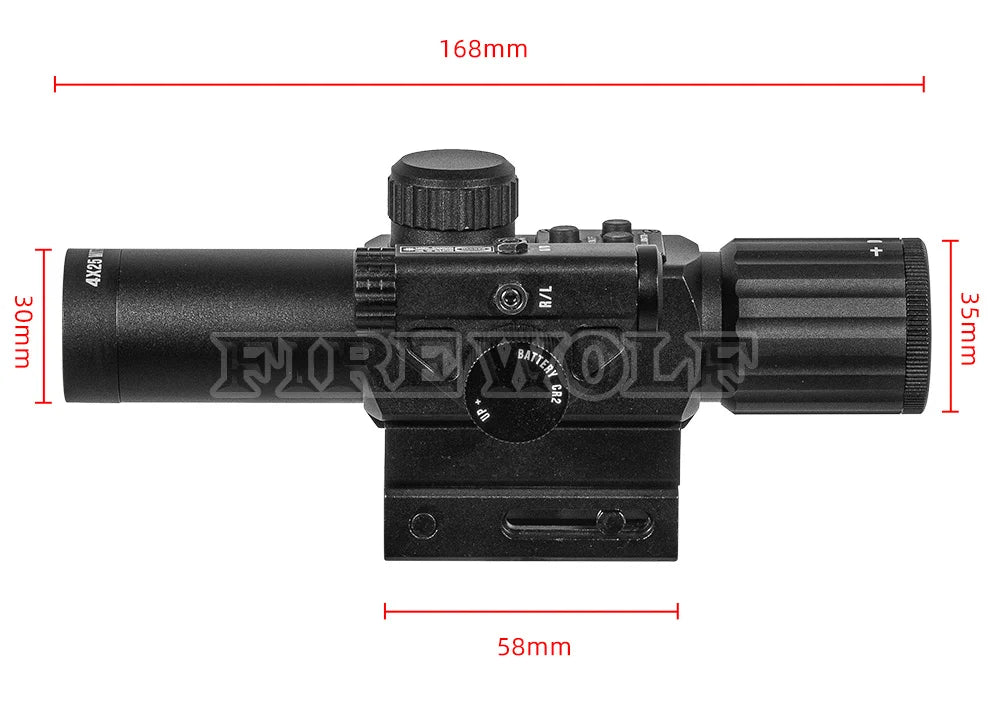 O Firewolf-M-4X25IR elimina a necessidade de carregar múltiplos acessórios. Com a luz verde iluminando seu retículo e o laser vermelho confirmando seu ponto de impacto, você tem a confiança necessária para cada disparo, independentemente do cenário.